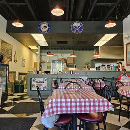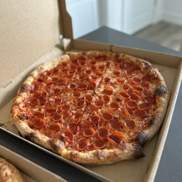 Oh yum!! This is the New York style pizza this area has been sorely missing before they showed up. (In fact, I was missing NYC pizza so badly, I recently took the oldest and the youngest kids back East just so we could have pizza in Manhattan and Brooklyn). Bottom line? I love pizza. I know pizza. I know what I like. And this place, I REALLY like! We're a family that rolls a little deep... five teenagers and two adults. We ordered two pizzas New York style; one cheese and one half cheese-half pepperoni. IMO, they were the perfect representation of true New York pizza. Thinner, chewy crust, pliable slices that fold in your hand, just the right kind of cheese, solid and simple red sauce...mmmmmm! As an added bonus, not only are the traditional red pepper flakes and Parmesan available table side, but so is hot honey - and theirs is addictively delicious. Everyone in our party of seven had two slices of pie (except one teen who had three) and we still ended up taking one slice home since everyone was happily stuffed. Ambiance? Cozy but bright... somehow small and spacious at the same time... super clean and maintained... very family-oriented and welcoming. A big thank you to Andrew, Andrew's Mom, and all the staff for making this a positive experience we look forward to having again very soon! (Note: We all loved the big round table inside where we could sit comfortably with room for our elbows. It's a great place to play a card/board game while you wait for your pizza, so bring one along and get comfy!)